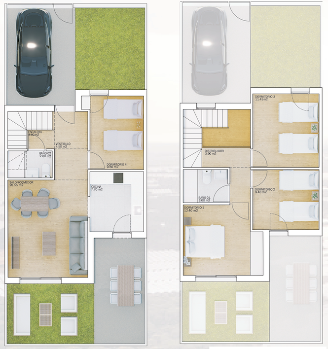 Amplios patios delanteros y traseros para disfrutar del exterior. El proyecto ofrece tres tipologías, todas ellas con la posibilidad de incluir un baño en más en planta alta en la zona de doble altura.